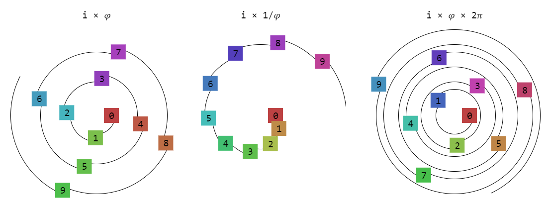 As you can see, the 𝜑 = 1.618033988749… constant allows selecting values on a hue circle such that sequential numbers are different and won't repeat. If you want a smoother transition, then using i × 1/𝜑 works a treat. If you want more contrast, then i × 𝜑 × 2𝜋 is nicer.